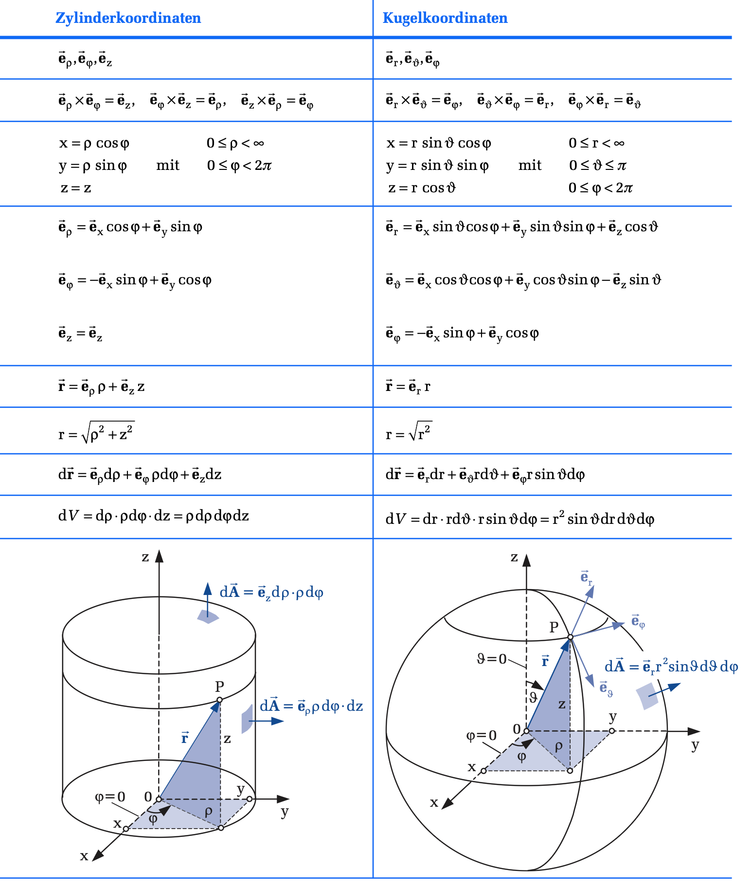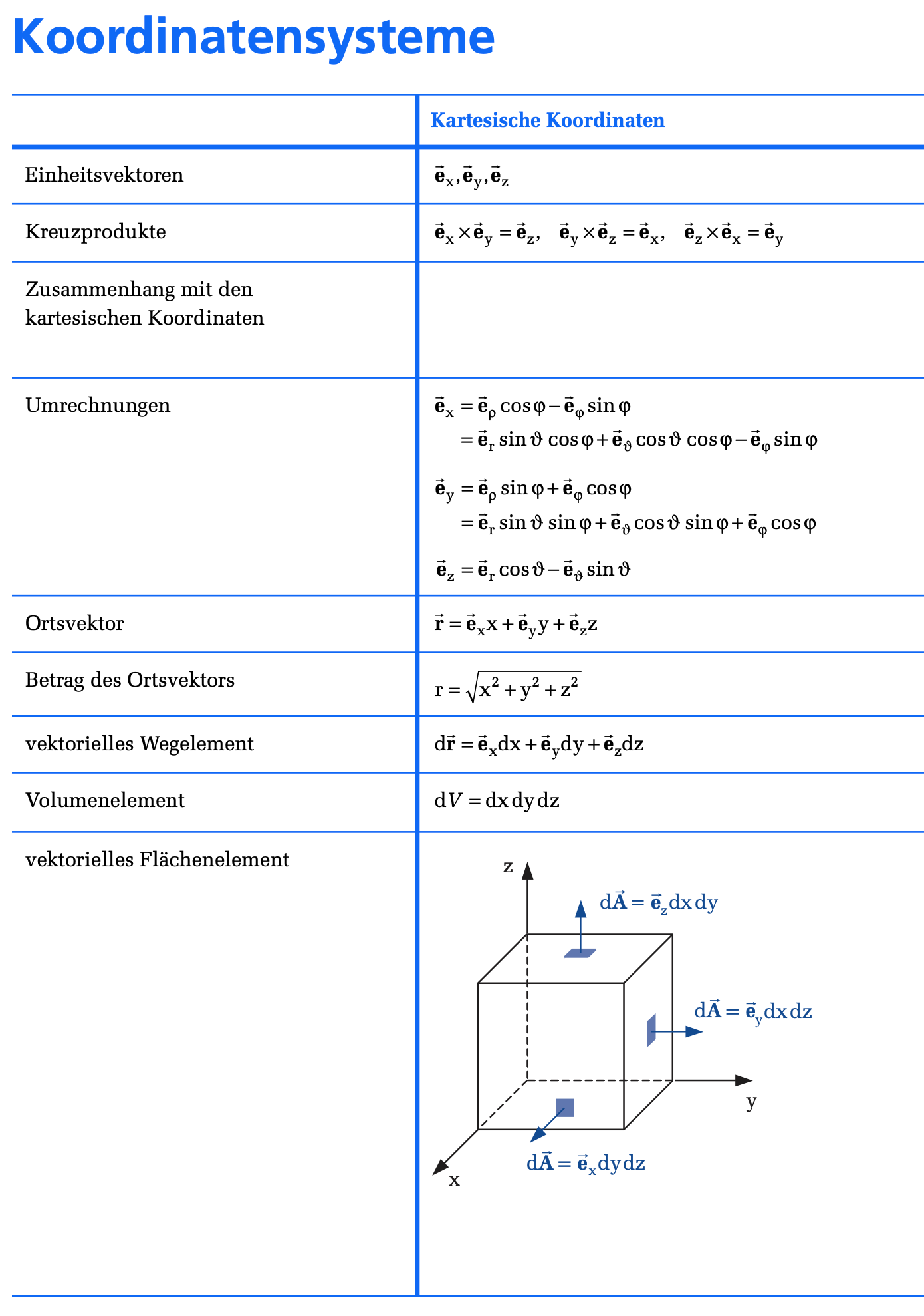 Dieser Anhang beschreibt drei wichtige orthogonale Koordinatensysteme. Orthogonal bedeutet, dass die Einheitsvektoren an jedem Punkt senkrecht aufeinander stehen. Es handelt sich um Rechtssysteme.
