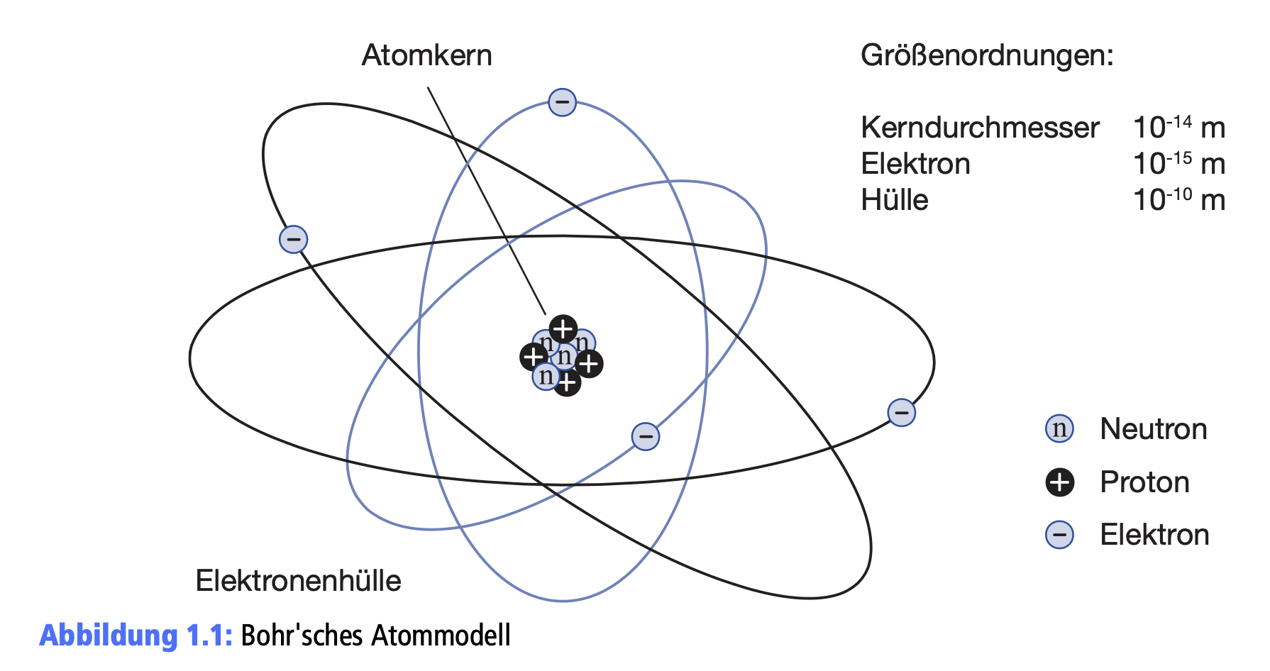 - Elektronenwolke oder im Niels Bohr Model die Elektronenhülle des Atoms ist gegen aussen neutral das heisst die Anzahl Protonen(), positive Ladungsträger, und Elektronen(), negative Ladungsträger, ist gleich.
