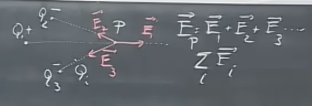 Das gesamte elektrische Feld (oder die Kraft) von mehreren Ladungen ist die Vektorsumme der Felder (oder Kräfte), die von jeder Ladung einzeln erzeugt werden.